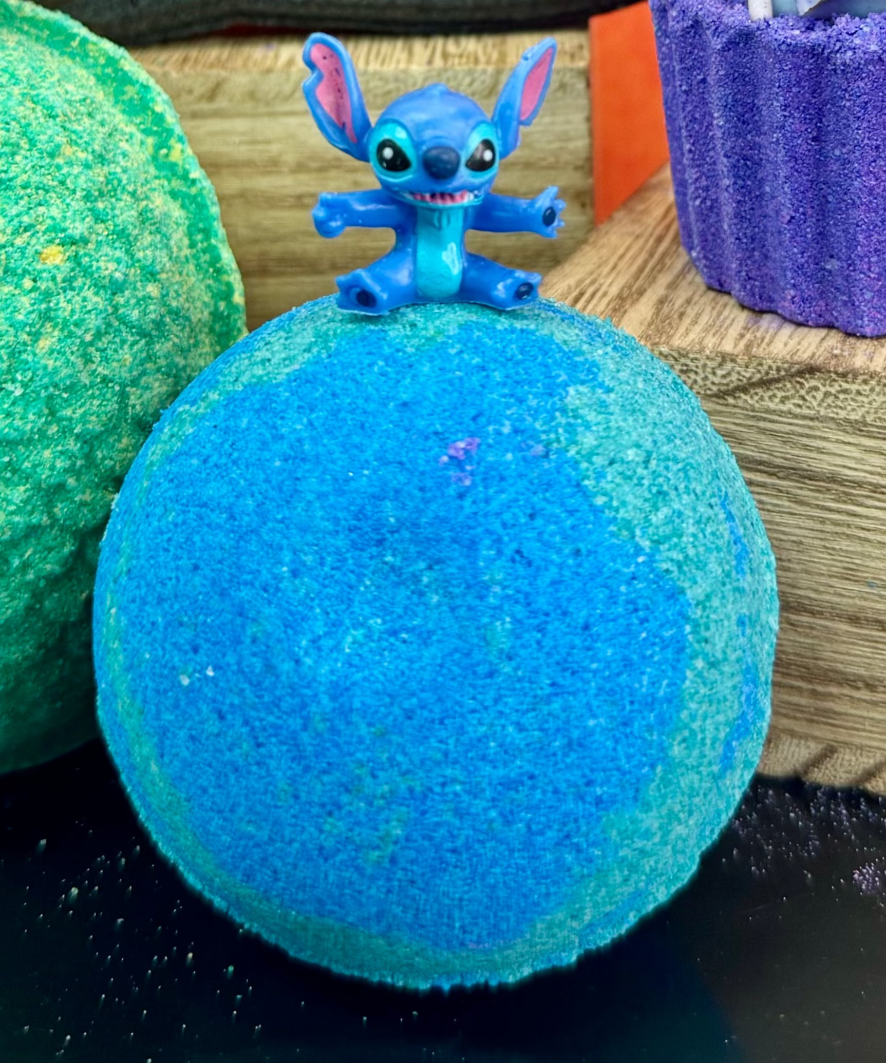 Turn bath time into a splash of fun and relaxation with our Stitch-Inspired Bath Bomb! Swirled in deep midnight blue and aqua hues, this fizzy bomb fills the tub with calming lavender fragrance that moms love β while hiding a surprise collectible toy kids canβt wait to discover.
